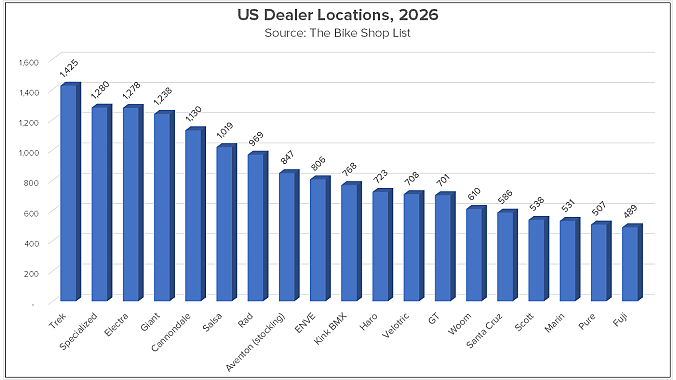 So this month, I went back to Michael Forte at The Bike Shop List and he’s prepared a much more extensive sampling of which bike brands have the largest dealer footprint.