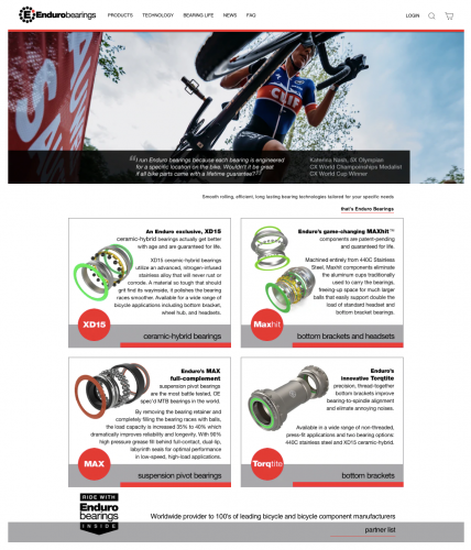 "Enduro Bearings has a long history of collaborating with bicycle companies to provide smooth-rolling, efficient, long-lasting bearings tailored to very specific needs," said Rick Sutton, director of business development and marketing. "Hopefully, our ongoing efforts — including this new website — will prompt customers to learn more about bearing design and manufacturing and then actively seek out Enduro's products at their local retailer when shopping for a new bike or servicing their current bikes."