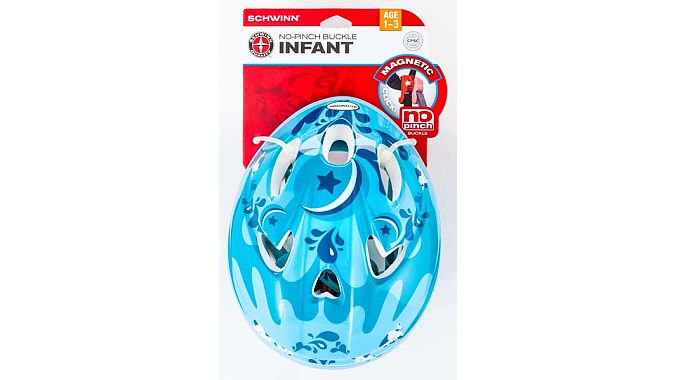 Only helmets with the magnetic no-pinch chin strap buckles are affected by this recall. The helmets are made for infants ranging from one to three years old. The helmet and its straps come in various colors and design patterns. The buckles have small plastic covers and enclosed magnets. "SCHWINN" is printed on the front of the helmets.