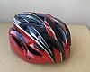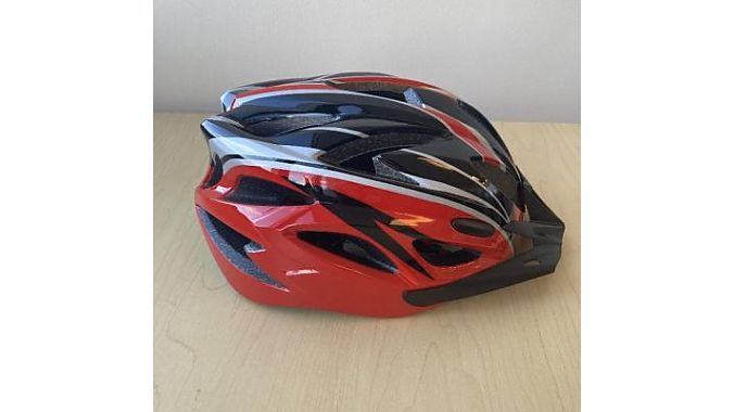 The helmets are in one size, fitting a head circumference of 22 inches to 24 inches. They are red and black with silver stripes and have gray padding. They have a removable visor, black straps with a silver reflective pattern in the center, a black-and-red buckle with a gray chin strap, and a black plastic knob at the back to adjust the fit. CPSC is aware that the firm also sold helmets in black/white and gray.