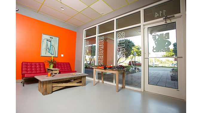 Among the Phat Cycles, Ridleys, Felts, Fujis and Dahons for sale sit a lounge area and a full-service coffee bar custom-made from concrete and palletized wood. Bright colors for walls and accents infuse the shop with a retro feel.